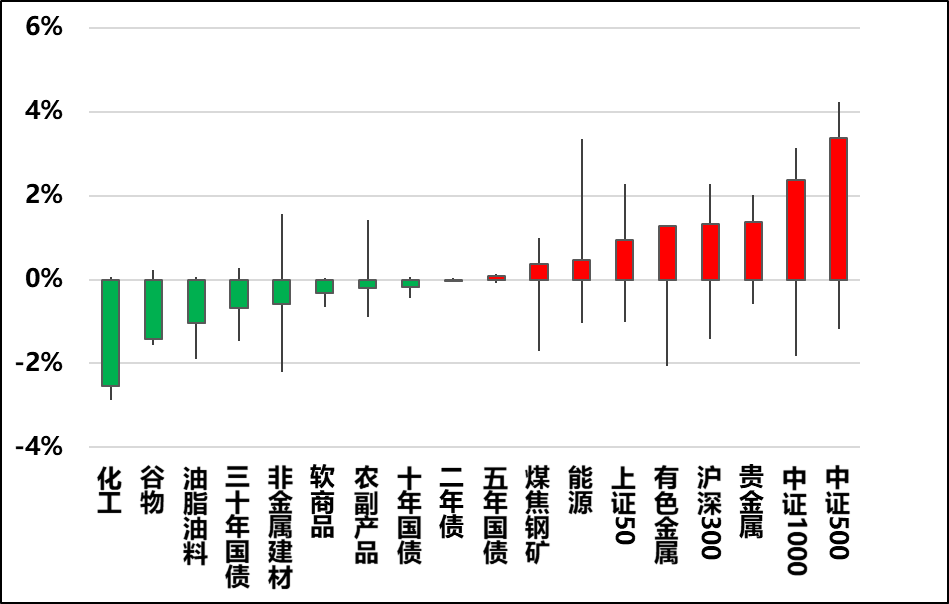 综合看,全球风险偏好上升,其中,国内权益市场抱团倾向明显,流动性改善是权益市场主要支撑,关注盈利预期改善的线索;国内宽松加码预期偏谨慎,债券上方压力持续;大宗商品强弱分化,内需商品相对偏弱,国际商品受益于美联储降息预期以及地缘政治,驱动偏强。
