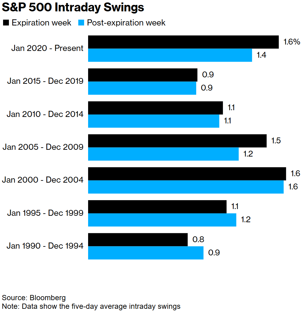周五的三巫日略显失色,市场观察人士淡化了其影响。回顾35年数据可见,标普500指数在到期周的日内波动往往略高于后续一周,这对常被鼓吹的"自由波动"理论形成挑战。