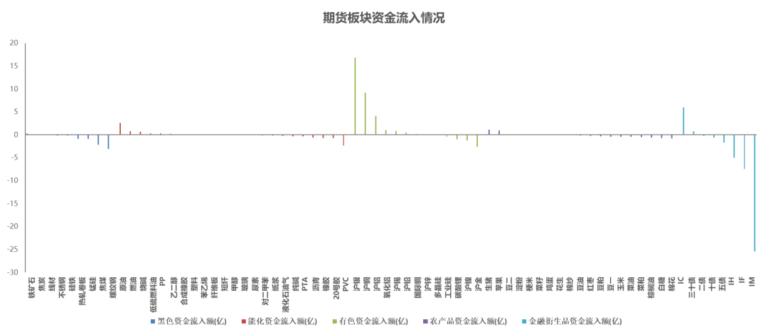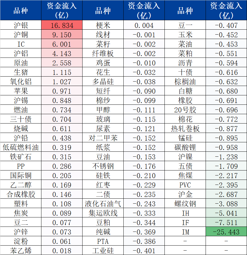 资金流入前三名为沪银、沪铜和IC;流出前三名分别为IM、IF和IH。