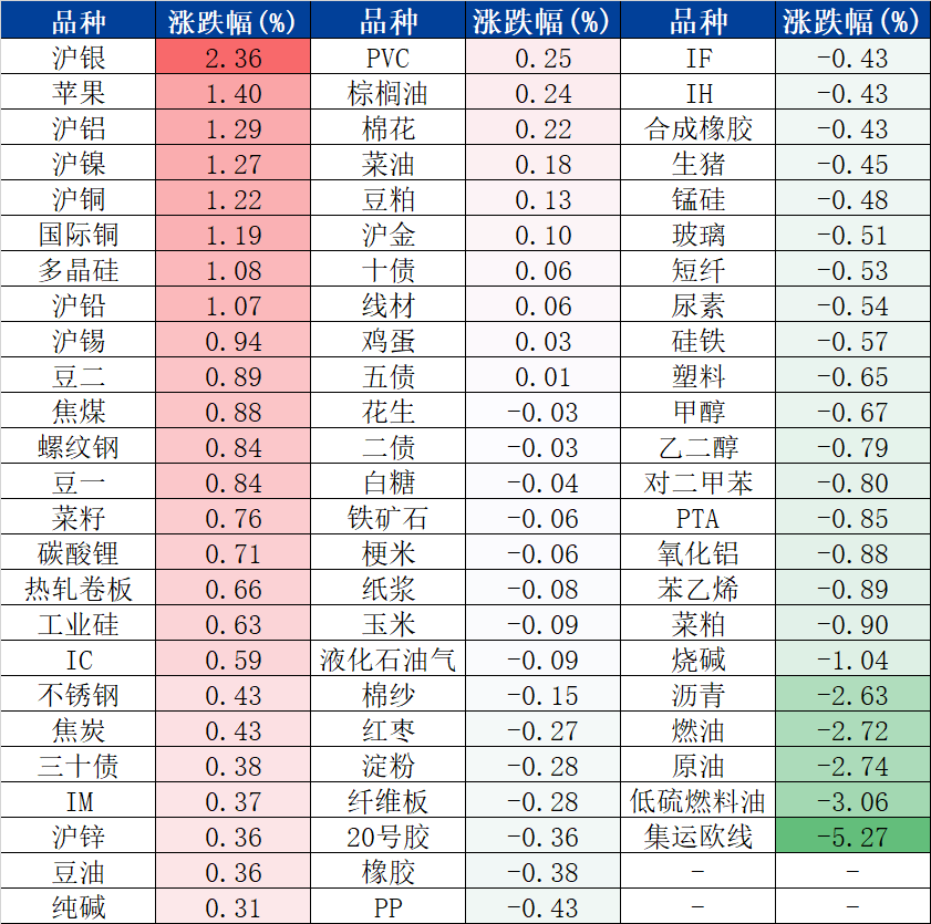 涨幅居前的三个品种分别是沪银、苹果和沪铝;跌幅居前的是集运欧线、LU燃油和原油。