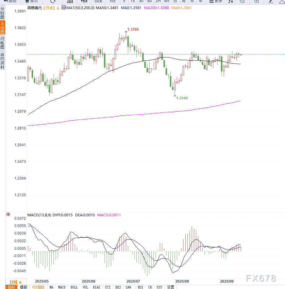 从日线图形来看,英镑兑美元在1.3500附近获得明显支撑,短期均线(如10日与20日均线)保持温和上行,对汇价形成托底。