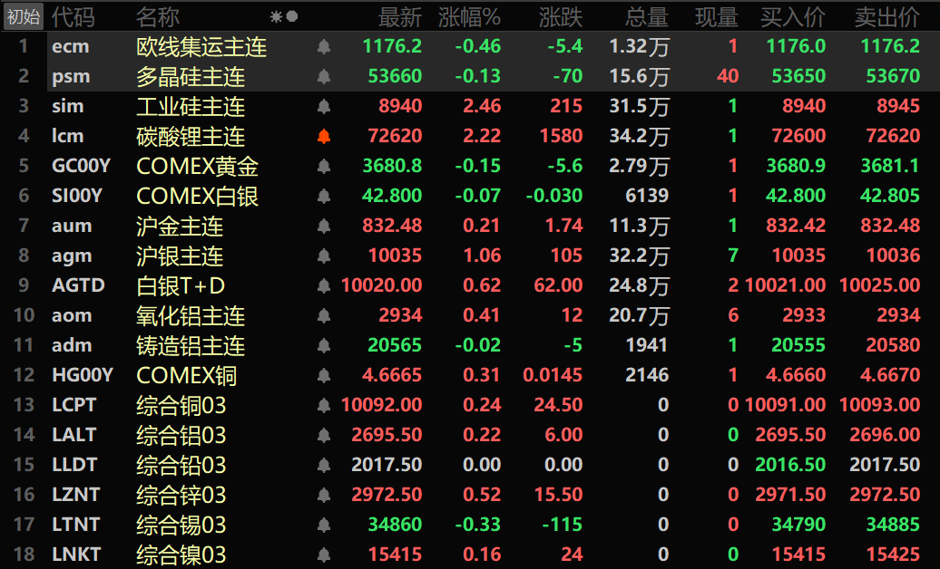 金属普涨沪镍、沪铅、工业硅、碳酸锂、沪银涨幅居前双焦涨近5%【SMM午评】
