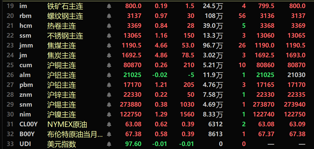 黑色系均上行,铁矿涨0.19%,螺纹涨0.97%,热卷涨0.84%,不锈钢涨1.16%。双焦方面:焦煤主力合约涨4.66%,焦炭主力合约涨4.86%。