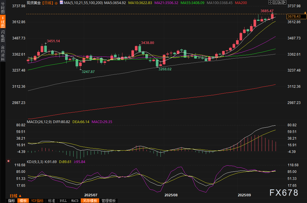 汇通财经APP讯——周一(9月15日),现货黄金价格强势收于每盎司3678.73美元,涨幅约1%,并在盘中一度触及3685.47美元的惊人纪录新高。这不仅仅是一次简单的价格波动,而是多重因素合力铸就的“黄金风暴”。美元指数疲软、美债收益率持续下行,以及投资者对美联储本周政策会议的热切期待,都在合力推动金价向上突破。尤其是,随着美联储为期两天的会议于周二拉开帷幕,市场普遍预期这将是自去年12月以来首次降息,黄金的涨势似乎才刚刚拉开序幕。周二(9月16日)亚市早盘,现货黄金窄幅震荡,目前交投于3677.81美元/盎司。
