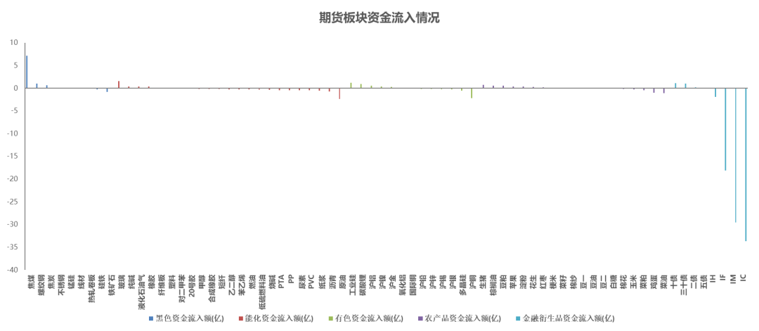 资金流入前三名为焦煤、玻璃和工业硅;流出前三名分别为IC、IM和IF。