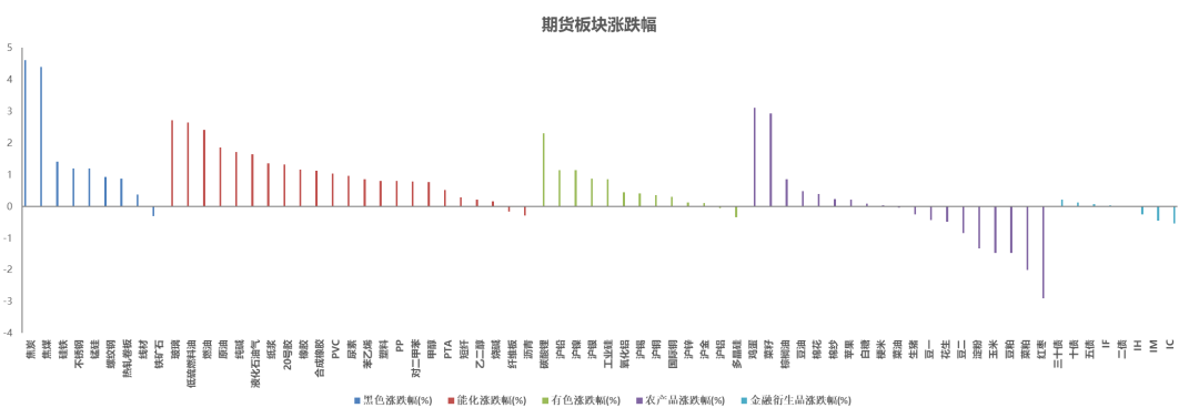 涨幅居前的三个品种分别是焦炭、焦煤和鸡蛋;跌幅居前的是红枣、菜粕和集运欧线。
