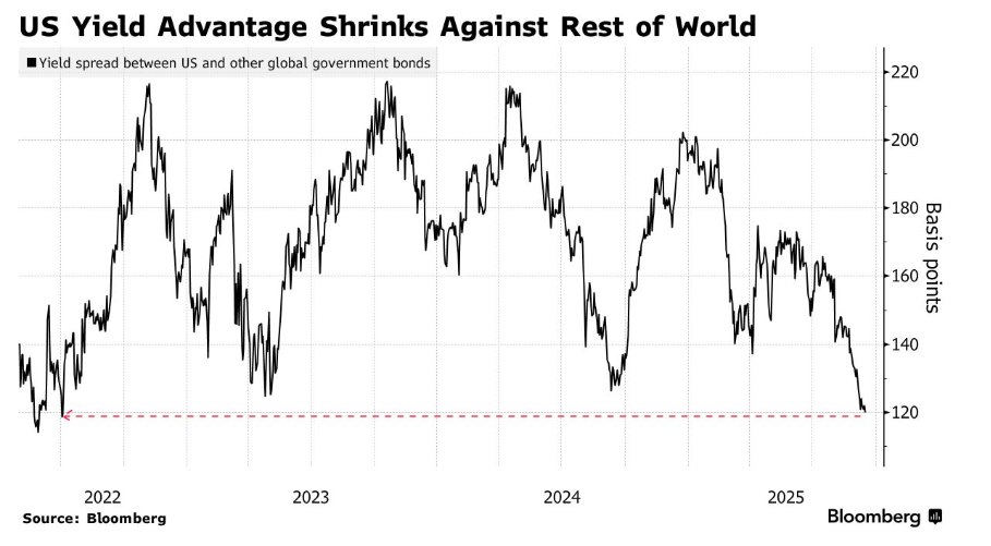 根据彭博美国国债总回报指数与非美国全球主权债相似指数之间的利差计算,美国国债相对于其他全球大型市场的主权国家债券的收益率优势周一缩窄至120个基点,远远低于一月份的逾200个基点。