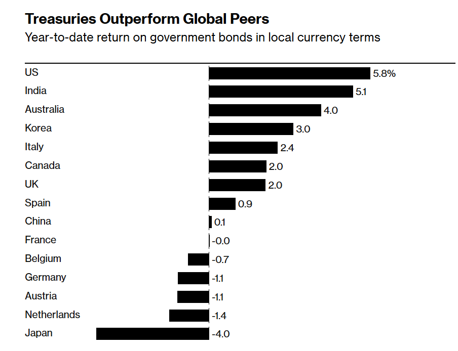 美国国债跑赢全球同行——按本币计价的2025年年初至今的投资回报