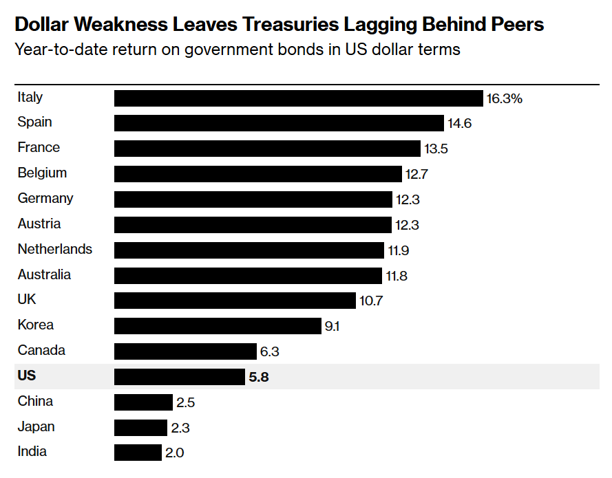美元走弱令美国国债以美元计价回报落后于同行——统一按美元计价的年初至今回报