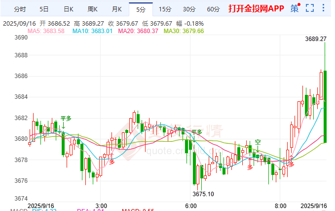 周二(9月16日)亚市早盘,现货黄金窄幅震荡态势,现报3677.81美元/盎司。受美元疲软、美债收益率走低及美联储政策会议预期影响,金价获多重支撑。因市场押注本周或迎年内首次降息,黄金涨势初显。截至发稿金价最新报3680.79美元/盎司,涨幅0.06%,最高上探3689.27美元/盎司,最低触及3675.10美元/盎司。