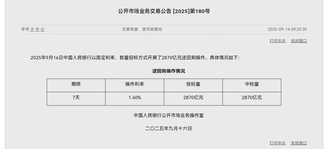 据中国人民银行网站9月16日消息,央行今日开展2870亿元7天逆回购操作,投标量2870亿元,中标量2870亿元,操作利率为1.40%,与此前持平。因今日有2470亿元7天期逆回购到期,当日实现净投放400亿元。