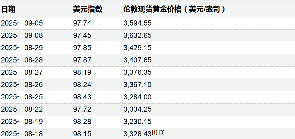 例如,2025年9月8日美元指数为97.45,较9月5日的97.74有所下降,而同期伦敦现货黄金价格以美元计价为3632.65美元/盎司,较9月5日的3594.55美元/盎司有所上升。这表明美元指数的下降可能为黄金价格上涨提供了支撑。[1] [2] [3]