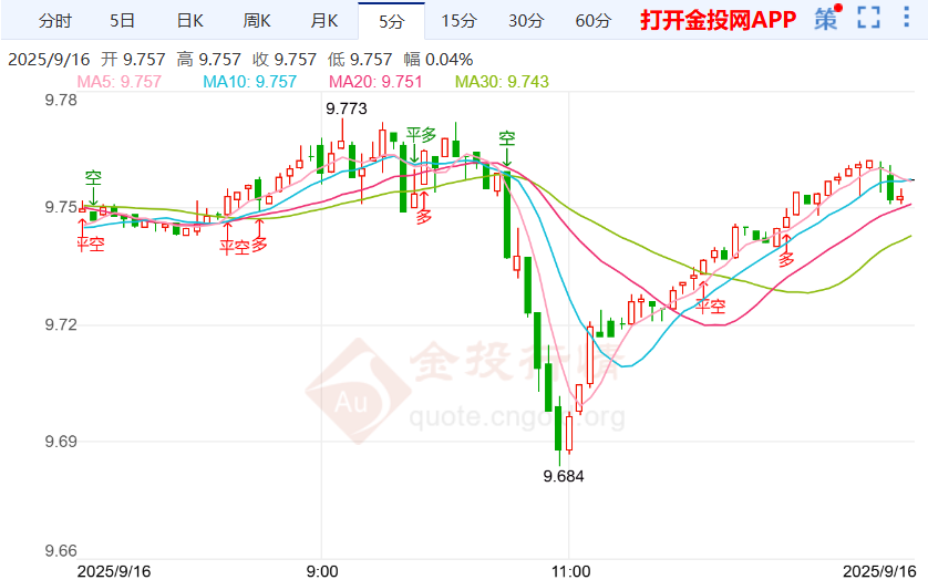 今日周二(9月16日)亚盘时段,纸白银目前交投于9.748一线上方,今日开盘于9.741元/克,截至发稿,纸白银暂报9.756元/克,上涨0.08%,最高触及9.774元/克,最低下探9.683元/克,目前来看,纸白银盘内短线偏向震荡走势。
