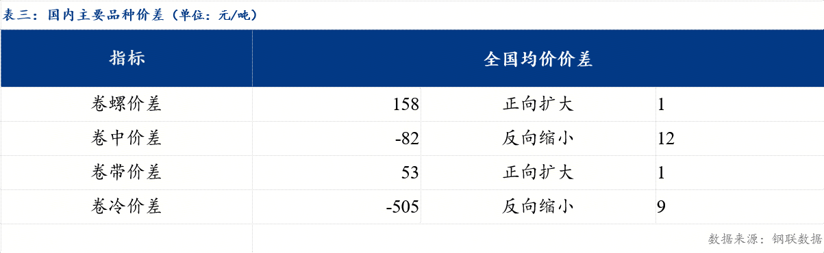 从品种价差来看,卷螺差较上一交易日正向扩大1元/吨 ,热中价差较上一交易日反向缩小12元/吨,热带价差较上一交易日正向扩大1元/吨 ,热冷价差较上一交易日反向缩小9元/吨 。