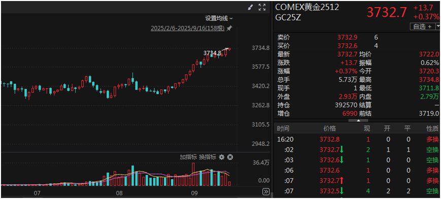 黄金ETF规模的大增与业绩表现息息相关。8月下旬以来,COMEX黄金发起攻势,截至9月16日发稿,近一个月涨幅超过10%,最新报价3732.7美元/盎司,盘中最高时一度触及3734.8美元/盎司,再创历史新高。