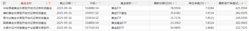 境内百亿级规模的黄金ETF又增加一只。数据显示,截至9月15日,永赢中证沪深港黄金产业股票ETF规模达到102.75亿元,成为境内第五大黄金ETF。同时,境内规模最大的黄金ETF——华安黄金易ETF也重回600亿元规模,达到625.95亿元,博时黄金ETF、易方达黄金ETF、国泰黄金ETF规模也稳稳地站在百亿元以上。