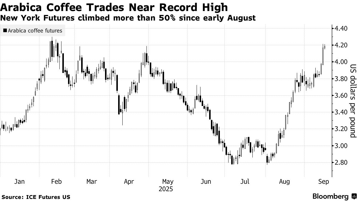 自8月初以来,受巴西干旱、美国对南美供应征收关税以及库存减少的推动,咖啡期货价格已上涨约50%。Hedgepoint Global Markets分析师Laleska Moda表示:“我们看到投机性买盘,尤其是在巴西8月出口数据公布、且认证阿拉比卡咖啡库存持续下滑之后。”“从巴西到大多数目的地的出货量总体上都在下降,但我们看到,由于关税,对美国的出货量下降幅度更大。”