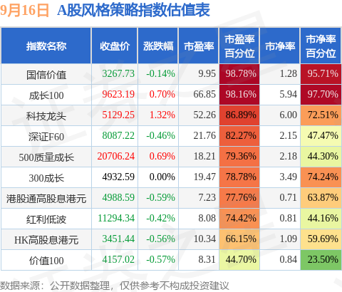 风格策略指数方面,国信价值的市盈率百分位较高,为98.78%。而价值100的市盈率百分位较低,为44.7%。