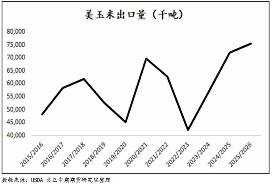 美玉米出口增长的原因主要有三个方面:一是美国玉米价格进入低位;二是主消费国自身产量下滑;三是主要竞争国存在出口干扰。2025/2026年度初始表现较为良好。