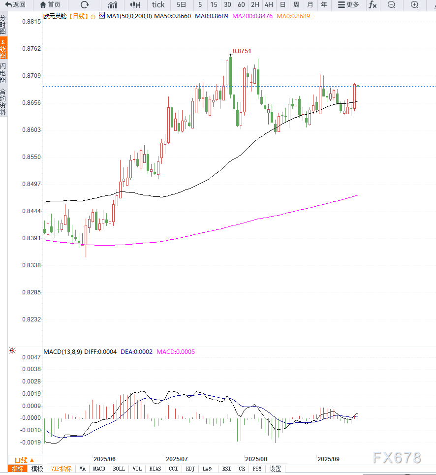从技术面来看,EUR/GBP短线维持震荡整理格局,目前徘徊在0.8670–0.8720区间。价格略高于20日均线,短线多空力量暂时均衡。