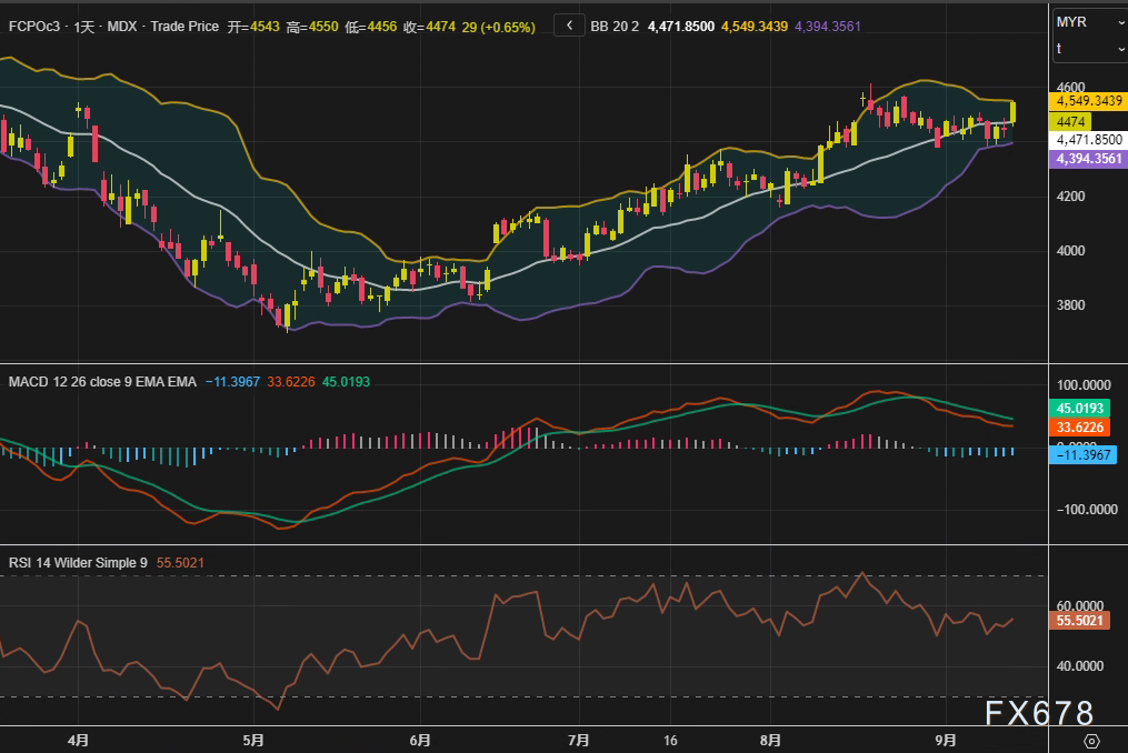汇通财经APP讯——周三(9月17日),马来西亚衍生品交易所(BMD)棕榈油主力合约FCPOc3小幅收高,但较日内高点明显回落。截至收盘,12月合约报收4474林吉特/吨,微涨4林吉特,涨幅0.09%。盘中一度冲高至2.35%,但随后受林吉特走强及需求端疲软压制,涨幅收窄。