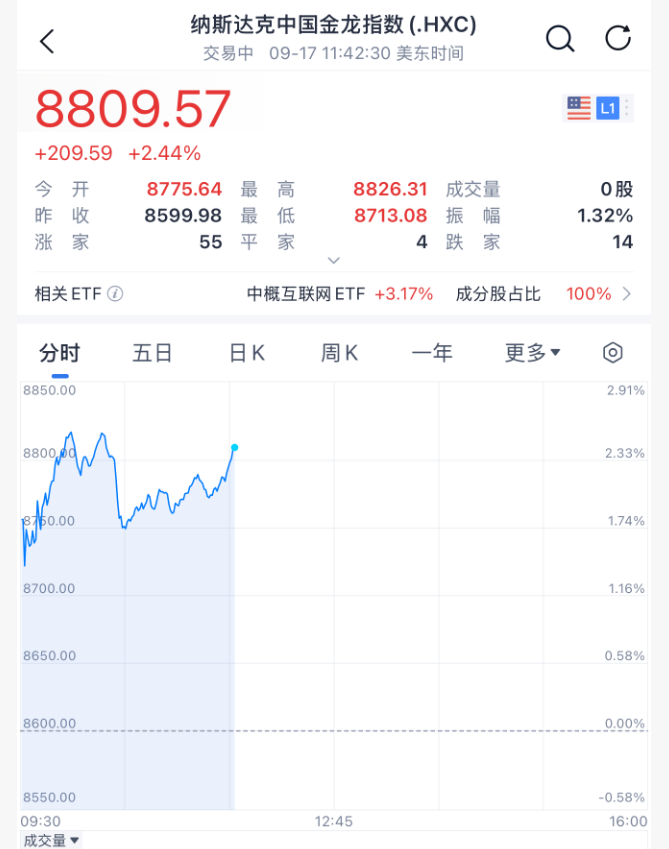 中概股继续大涨,纳斯达克中国金龙指数涨超2%。