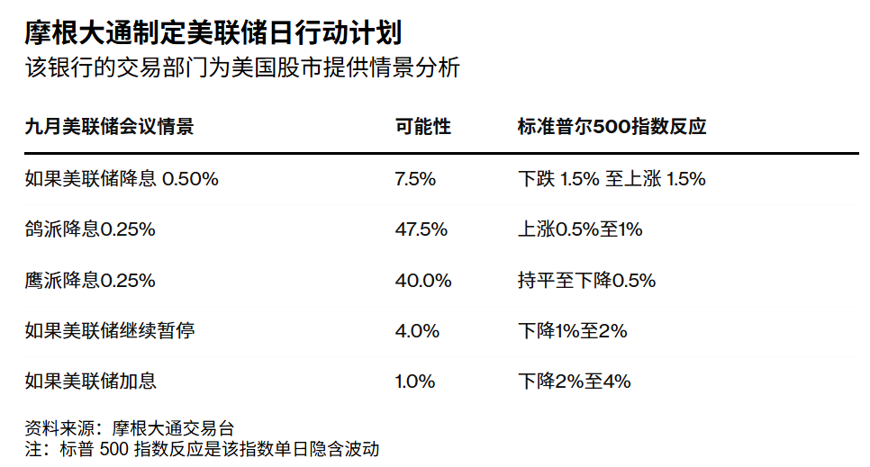 尽管“意外”空间不小,但期权交易显示,市场押注这次反应将比平常更平稳。摩根大通的Andrew Tyler表示,最可能的情形是降息25个基点:只要鲍威尔偏鸽,并释放循序渐进的降息信号,标普500指数或将上涨0.5%~1%。