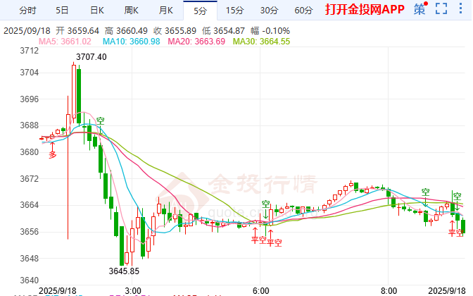 周三(9月18日)亚市早盘,现货黄金交投于3668.12美元/盎司附近。美联储如期降息25个基点,却意外引发黄金市场的剧烈震荡。截至发稿金价最新报3658.75美元/盎司,跌幅0.02%,最高上探3671.65美元/盎司,最低触及3654.80美元/盎司。