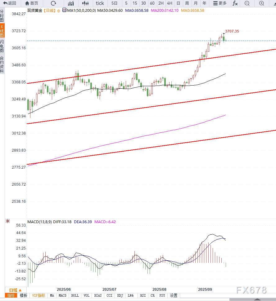 XAU/USD在日线上呈现明显的多头趋势,周三触及历史高位3707美元后开始回调整理。价格在3645美元附近获得支撑,该位置原为前期阻力位,现转为关键支撑,短线下跌空间有限。