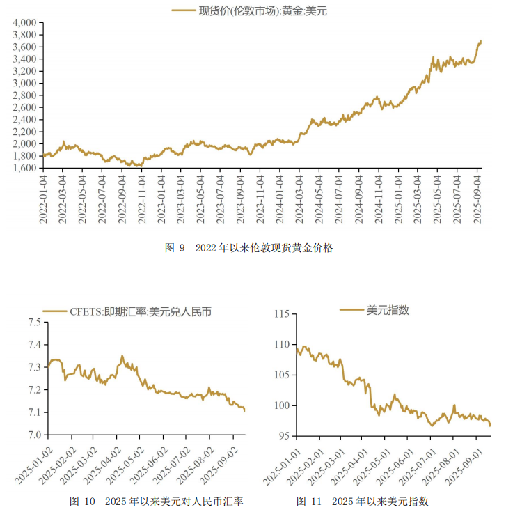 黄金将受益于美联储降息,但高位回调的风险依然存在。伦敦现货黄金价格自2022年俄乌冲突以来已经翻倍,创下1980年以来黄金最大和最快涨幅,这一涨幅或已经计入了地缘形势动荡,以及中美大国博弈的影响。今年4月以来的黄金上涨,或又受到新的因素的影响,特别是美国所谓对等关税政策抬高了美债收益率下行的压力,对于美债的担忧转化为对于美元的担忧,美元指数从4月的104下行至当前的97。但是随着美联储重启降息,以及美联储的持续缩表,美债的压力将有所缓解,再加上美联储调高经济增长预期和通胀预期,美元指数走强也有一定支撑,再考虑到黄金本身并不产生利息收入,黄金买盘止盈离场的动机并未走低,黄金高位回调的风险依然存在。