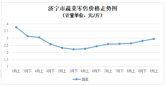 蔬菜价格小幅上行。济宁市集贸市场重点监测的17种蔬菜价格呈现“4降13升”态势,综合均价为2.94元/斤,环比上涨4.82%。其中涨幅居于前列的有黄瓜和青辣椒等,环比分别上涨21.24%和15.53%。