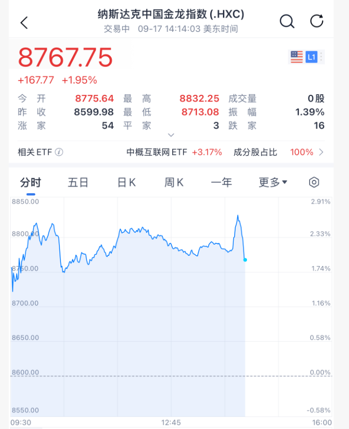 中概股指数一度涨超2%,随后涨幅收窄。