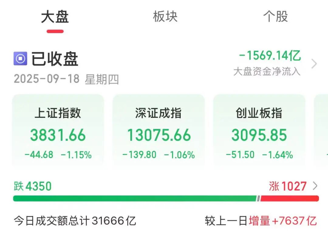 截至收盘,上证指数跌1.15%,深证成指跌1.06%,创业板指跌1.64%,北证50指数跌1.01%。沪深京三市全天成交额为31666亿元,较上一日放量7637亿元。全市场超4300只个股下跌。
