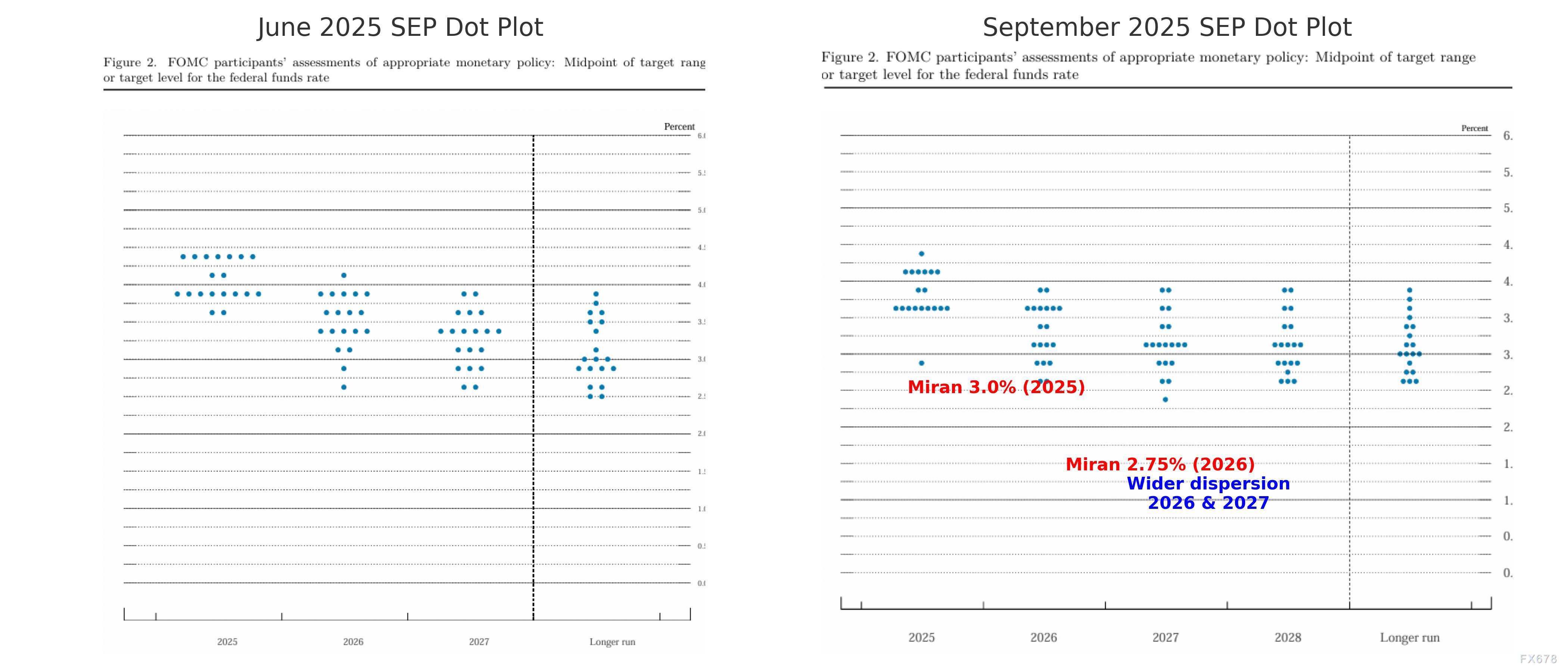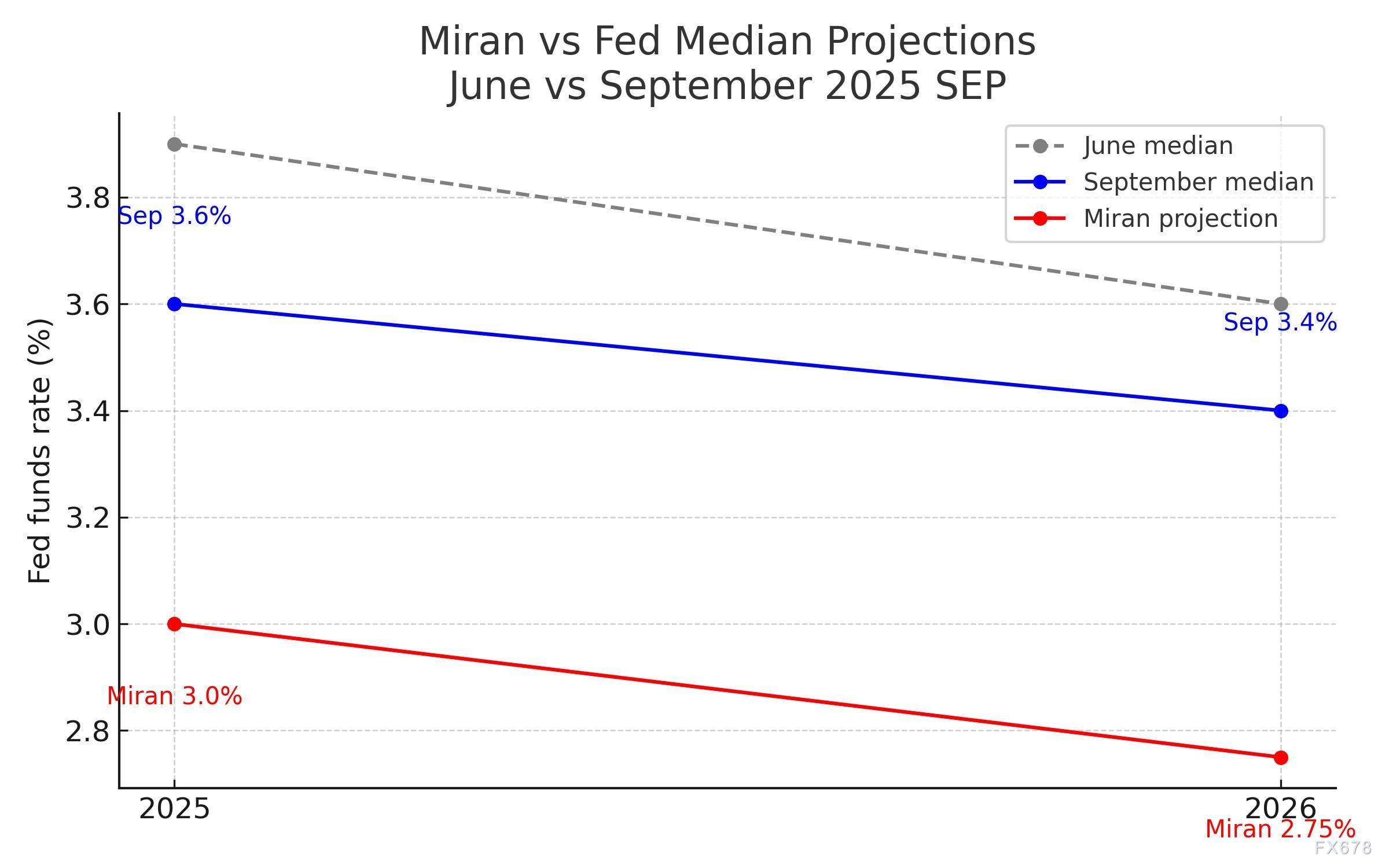 点阵图如同一面镜子,映照出美联储内部对经济未来的分裂判断。米兰预测2025年底利率低至2.75%–3.0%,沃勒加入其“低利率阵营”,而一名鹰派成员孤注一掷,主张加息至4.5%。这一从2.9%到4.4%的预测范围,远超6月时的3.5%–3.75%,标志着FOMC内部辩论从边缘走向中心。