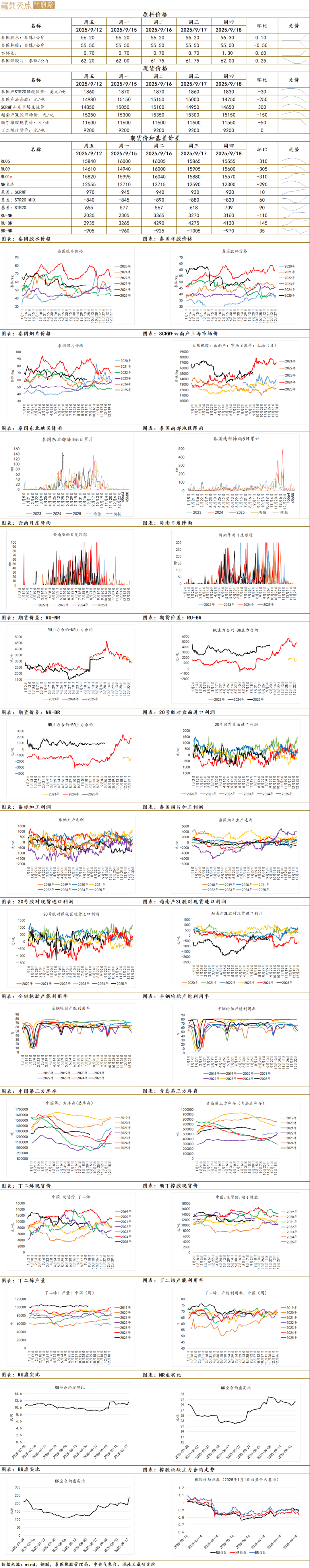 总结及操作建议,近期天胶期现同步下探,我们认为主要是以下原因:一是供应端上量预期开始被提前交易,在5-8月降雨较多的情况下,9月降雨可能开始出现好转,亦吻合泰国步入旺产的节点,需要关注原料价格变化;二是宏观层面美联储降息之后,对于宏观属性较强的品种来说短期有利好出尽之味,近两日大宗及股指迎来回调,短期可能缺乏宏观题材的炒作,不过我们预期本轮回调幅度或有限,中长期仍然存在较好的宏观环境。三是近日有抛储全乳及烟片的消息传出,量级暂未知晓,在国储库存公认较低的情况下仍然有抛储的情况发生,这可能使得市场担忧国储实际库存或被低估。总的来说我们认为本次下跌趋势的结束可能是宏观情绪转向,供应端虽然存在放量预期,但目前原料价格仍然较强,现货亦表现强势,泰混-ru01居于历史高位,后续重点关注泰国天气情况以及国内政策变动。