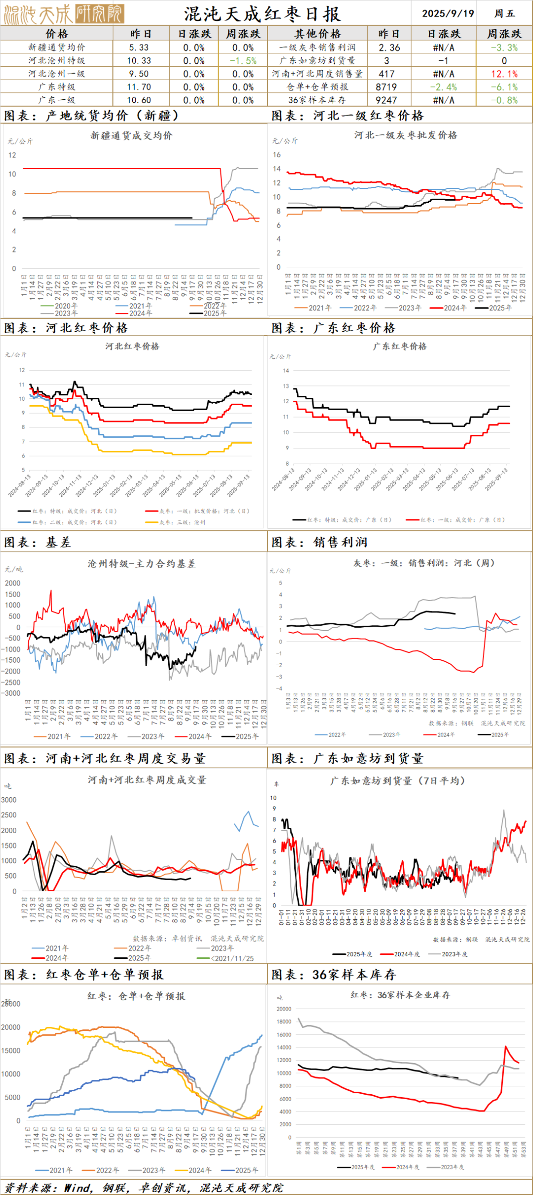 河北崔尔庄市场红枣到货1车,下游按需拿货;广东如意坊市场到货3车,客商挑选合适货源按需采购,成交在1车左右;盘面偏弱运行,天气影响减弱,根据预报未来一周没有明显降水;中秋节备货临近结束,现货上涨预期消弱;供需整体仍维持偏空看待,下树前可能仍存在反复,红枣维持逢高空的策略。