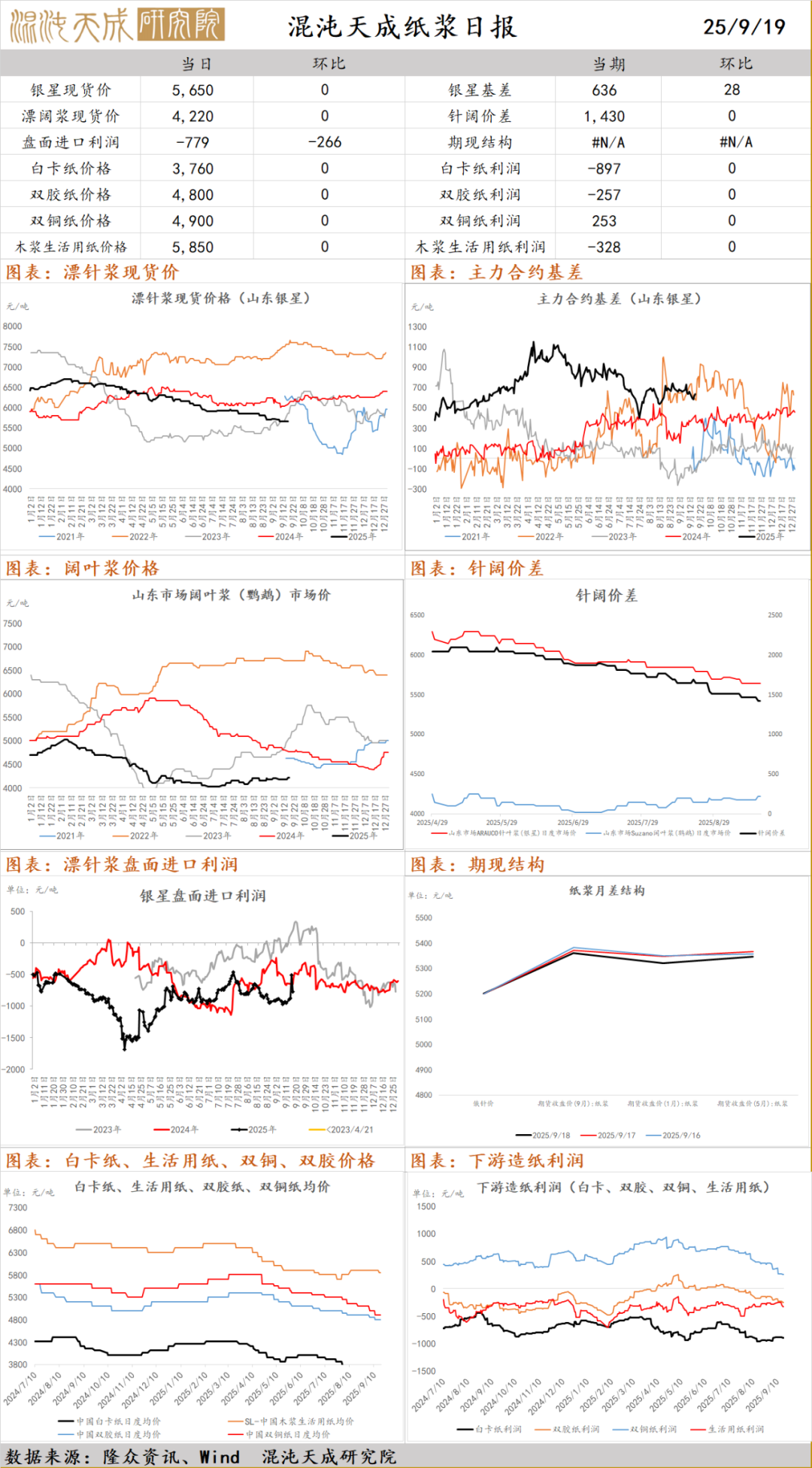 纸浆:昨日国内针叶浆现货小幅下跌,银星5650元/吨(0),俄针5200元/吨(-50);阔叶浆现货稳定,金鱼4220元/吨(0);针阔叶浆价差1430元/吨(0),现货市场交投一般;白卡纸市场行情变化不大,业者保持观望态度;生活用纸市场平稳运行,市场交投氛围略显清淡;文化用纸市场稳盘为主,刚需散单成交为主,贸易商多谨慎操盘;本周国内纸浆主流港口样本库存量为211.2万吨,较上期累库5万吨,环比上升2.4%;本周下游开工,白卡纸环比+4.7%,双胶纸环比+1.9%,铜版纸环比+6.5%,生活纸环比-0.1%;宏观利好释放过后,盘面由强转弱;行业基本面没有明显改观,需求改善不显著及旺季不旺,上方有一定压力,下方有成本支撑,关注纸厂补库和政策影响持续性,不宜过度看空。