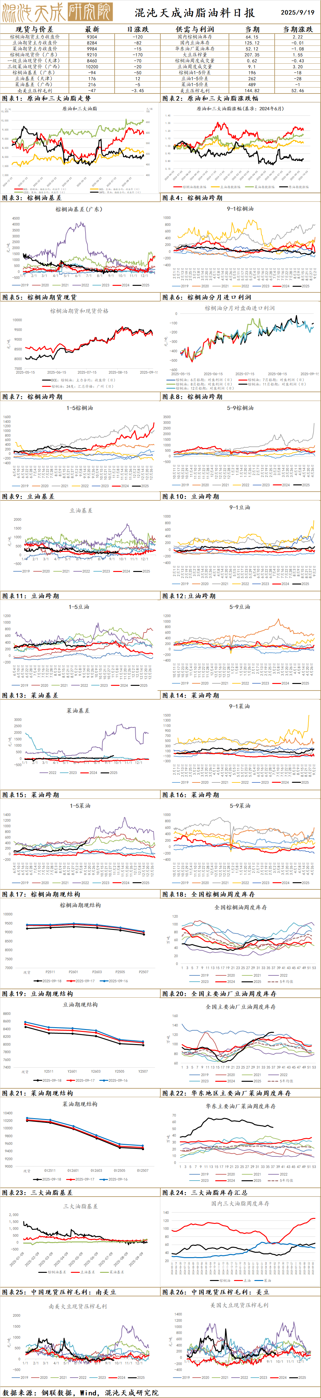 供给端:据马来西亚南部半岛棕榈油压榨商协会(SPPOMA)数据显示,2025年9月1-15日马来西亚棕榈油单产环比上月同期减少6.94%,出油率环比上月同期减少0.21%,产量环比上月同期减少8.05%;船运调查机构SGS公布的数据显示,马来西亚9月1-15日棕榈油出口量为404688吨,较上月同期出口的537183吨减少24.66%;马来西亚棕榈油局(MPOB)公布了马棕8月数据:8月马棕产量185.5万吨,环比增加2.35%,出口132.5万吨,环比减少0.29%,机构预估出口145万吨,实际公布的出口量小于预期,月马棕表需49万吨,几乎是单月最高表需,最终马棕库存220.25万吨,环比增加4.18%,和预期一致;印尼林业小组计划从9月1日起,对约427万公顷(1.055万英亩)林区内未获得许可运营的矿山进行打击,工作小组已经于3月启动了所谓的“纪律行动”,打击非法棕榈油生产,并派遣军方人员接管了逾330万公顷种植园;印尼棕榈油协会(GAPKI)数据显示,6月毛棕榈油产量环比飙升15.8%至482万吨,今年上半年总产量(含棕榈仁油)达2789万吨,同比增长6.5%,印尼6月棕榈油出口达361万吨,在中国和印度等主要买家需求激增推动下环比猛增35.4%,6月底印尼棕榈油库存仍环比下降13%至253万吨。