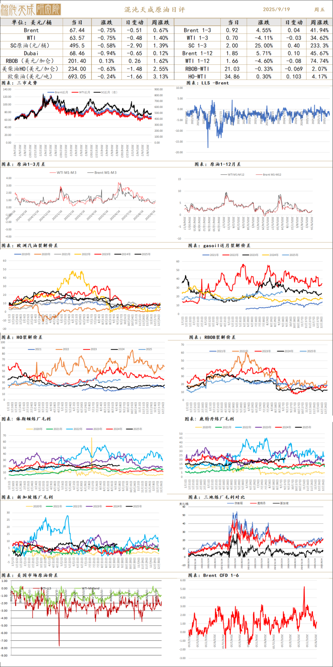 库存:截至9月12日,EIA原油库存下降929万桶/日,汽油库存下降235万桶/日,馏分油库存上升405万桶/日。