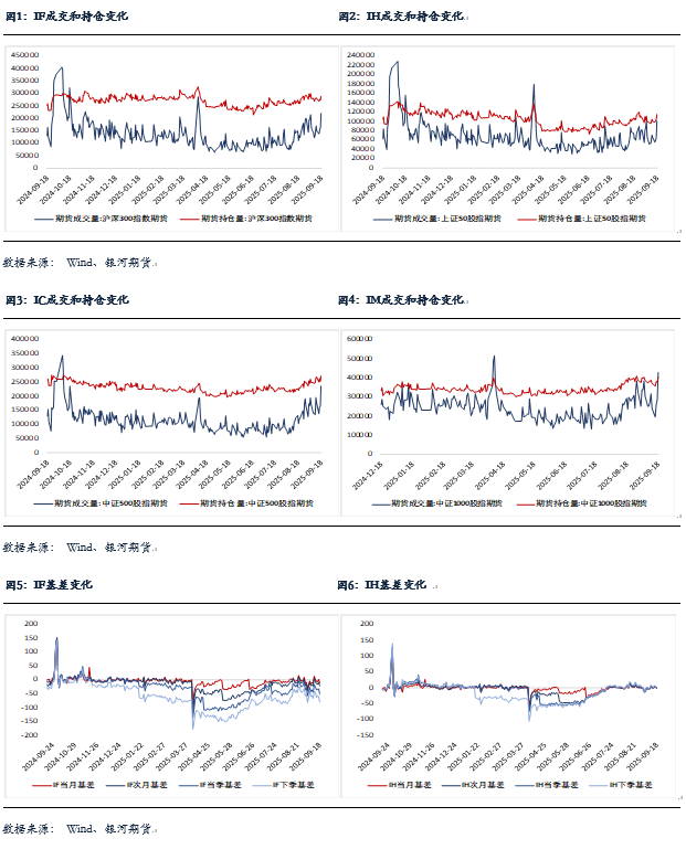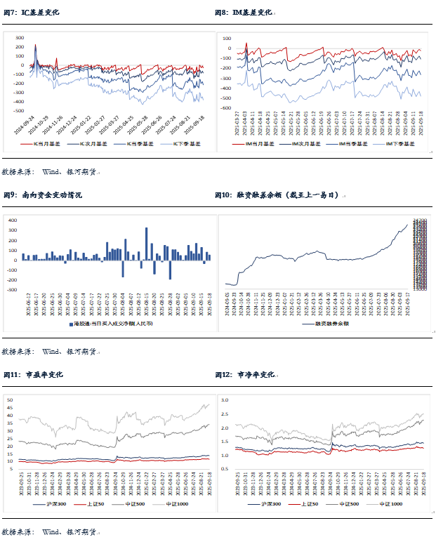 股指期货随现货回落,至收盘,主力合约IH2509跌1.45%,IF2509跌1.35%,IC2509跌1%,IM2509跌1.19%。各品种基差整体下行,行情波动加大,临近交割贴水反而增大。IM、IC、IF和IH成交分别增加50%、44.2%、35.4%和55.3%;持仓分别增加6.8%、7.6%、5.4%和9.6%。