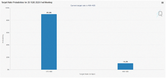 美联储此次降息25基点符合市场预期,但联储官员对未来降息节奏存在巨大分歧。截至9月18日,CME FedWatch工具显示,市场对10月再度降息25个基点的概率预期已达到89.8%,对2025年四季度前累计降息75个基点的预期也达到60%以上。鲍威尔却表示后续将“更加关注就业数据而非通胀数据”。