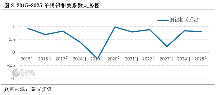 就相关系数来看,剔除极端情况的2019年,2015-2025年铜铝平均相关系数在0.7360,2015年铜铝相关系数为0.9249,2020年时为0.9840。自2021年起,随着铜价冲高,铜铝相关系数开始走弱,直至2025年下降至0.8045,较2015年缩减0.1204,幅度同为13%。