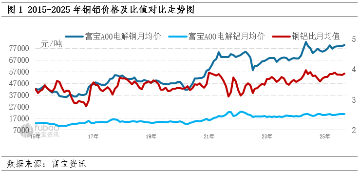 从历史铜铝价格及比值走势对比图可以看到,铝和铜在大多数时段走势相近,价格重心同步抬升,但价差逐渐拉大,铜铝比走阔。2015-2025年平均铜铝比为3.4970,但2015年铜铝比仅为3.3864,2020年时为3.4369。自2021年起,随着铜价攀升,铜铝比开始抬升,直至2025年抬升至3.8267,较2015年扩大0.4403,幅度达到13%。铜铝比的扩大,一方面是铜对铝的带动作用将愈加加强,另一方面是铝对于铜的替代范围将愈加扩大。