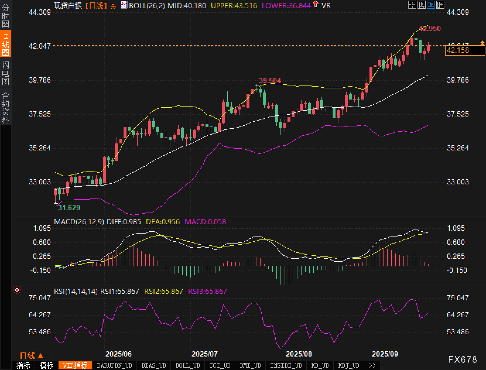 从日线图看,价格自6月低点后沿上升通道攀升。布林带中轨在40.180,上轨43.516、下轨36.844,价格仍运行在中轨之上,体现趋势延续的多头结构。前高42.950与上轨43.516共同构成本轮上行的第一、第二阻力区。若向上突破并有效站稳,则意味着上升通道加速;反之,若在42.950附近反复受阻,则需警惕“摸高回落—回测中轨”的节奏。