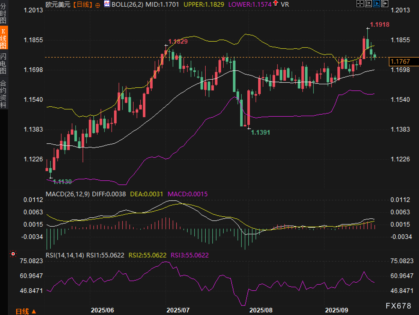 日线图显示,布林带上轨1.1829,中轨1.17,下轨1.1574。本周早些时候汇价一度上探,并在1.1918附近留下阶段性高点后回落,当前价格位于中轨与上轨之间,属于“上沿受阻后的均值回归”。K线结构呈连续三根较小实体阴线,形态更像技术性回撤而非快速反转;只要1.17一线不失守,上升通道的短期有效性仍可维系。