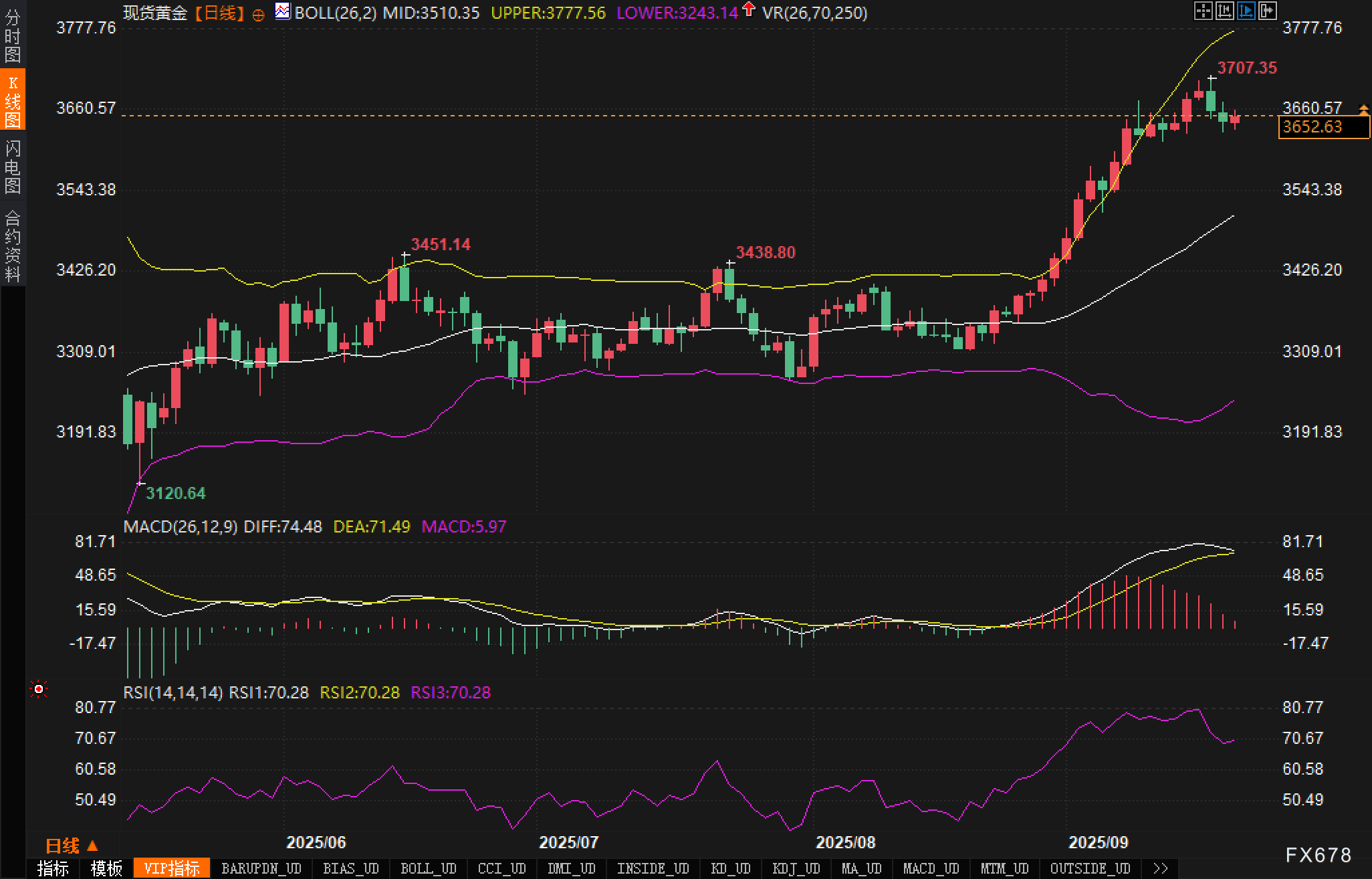 日线K线图显示,布林带上轨位于3777.56,中轨3510.35,下轨3243.14。价格自8月末起沿上轨加速,并在3707.35处冲顶后出现两连阴回撤。整体仍运行在布林中轨之上,高位“回测—整理”的结构更像一次趋势中的动能换挡而非立刻的趋势反转。
