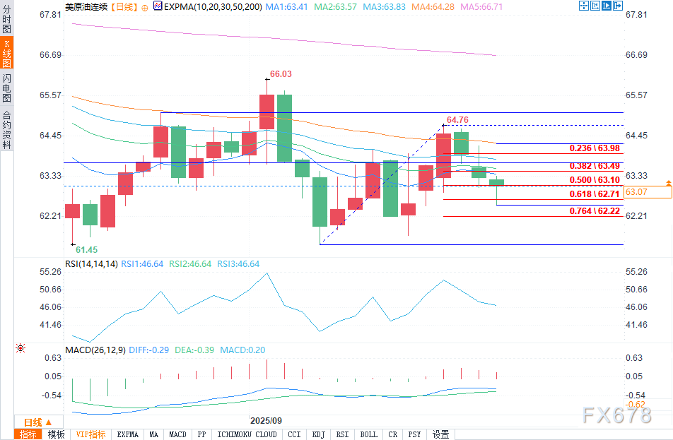 当前油价波动区间为61.45美元至64.76美元,价格处于50%中点63.10美元下方。对波段交易员而言,这属于典型的回调;但对趋势追随者来说,油价处于多条关键均线下方,标志着看空格局形成。