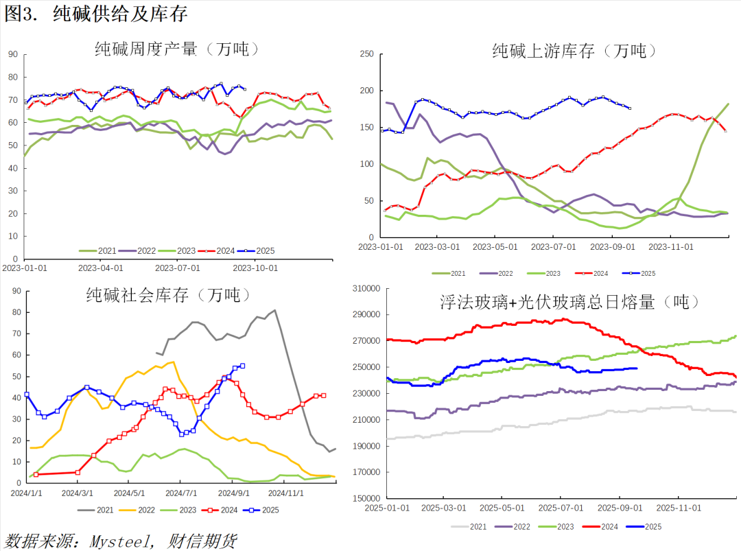 需求端,据mysteel数据,周内,浮法日熔量16.02万吨,环比持平,光伏日熔量8.88万吨,环比持平。下周,浮法玻璃产线或运行稳定,光伏玻璃一条1200吨产线计划点火。出口方面,7月份纯碱出口16.1万吨,进口0.32万吨,净出口仍然处于高位水平。利润方面,截至2025年9月18日,中国氨碱法纯碱理论利润-36.75元/吨,环比下跌0.45元/吨;中国联碱法纯碱理论利润(双吨)为-70.50元/吨,环比下跌16元/吨。