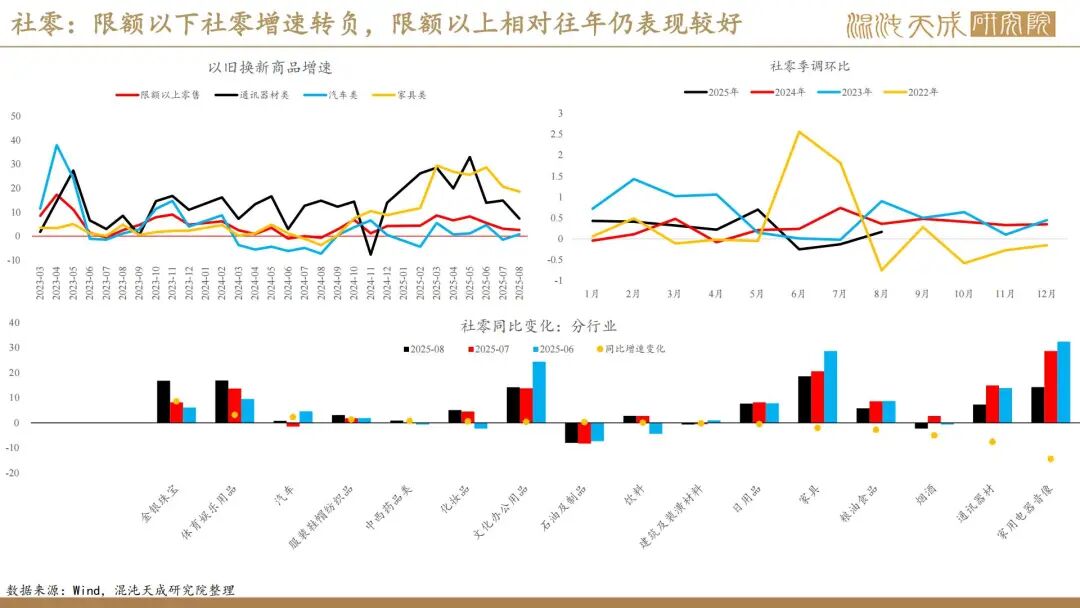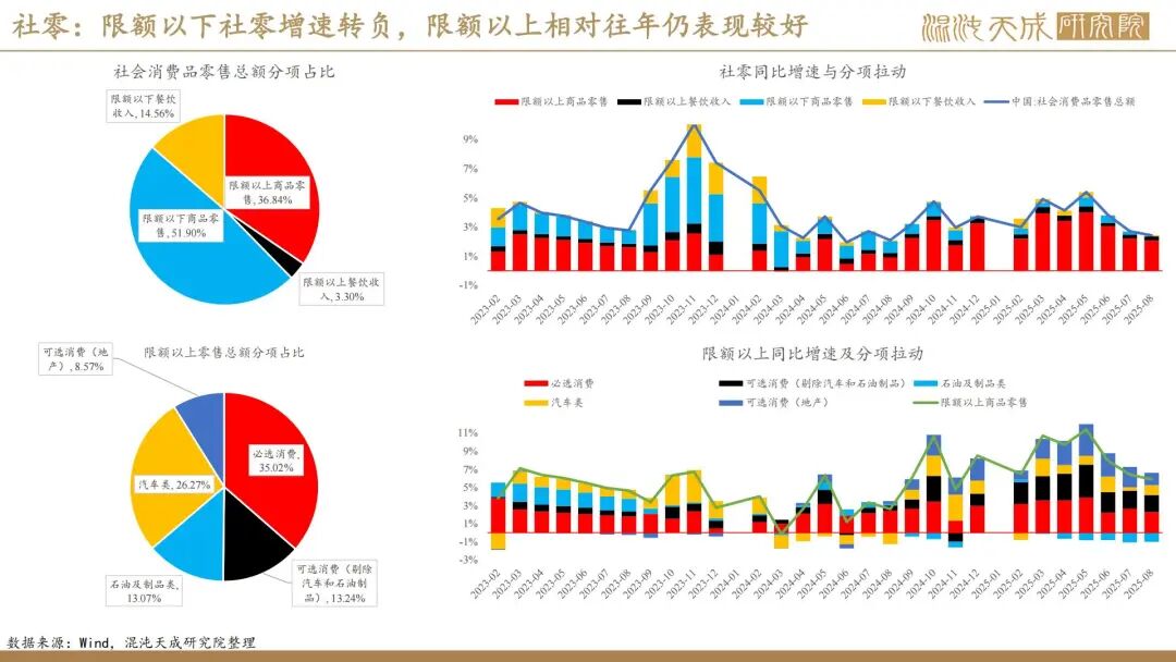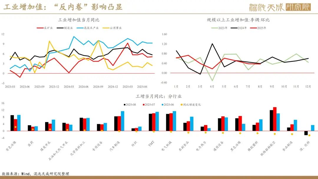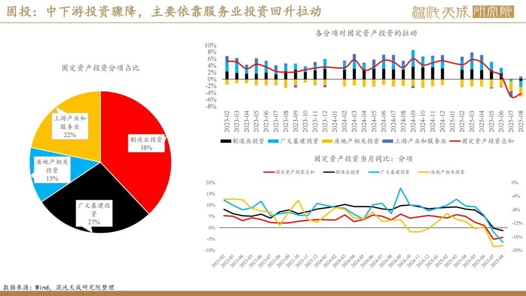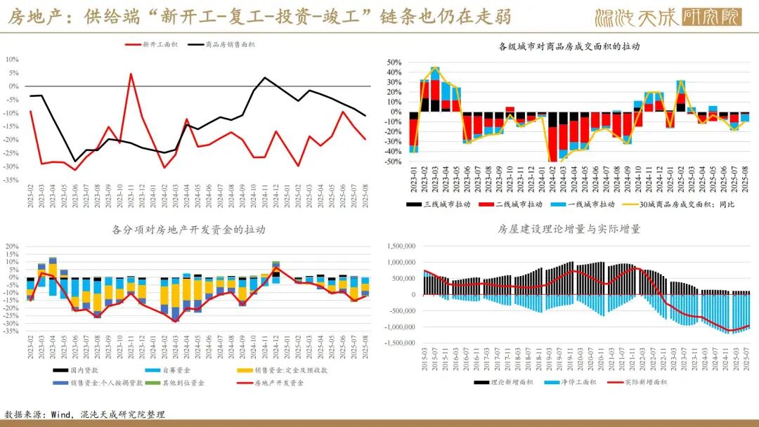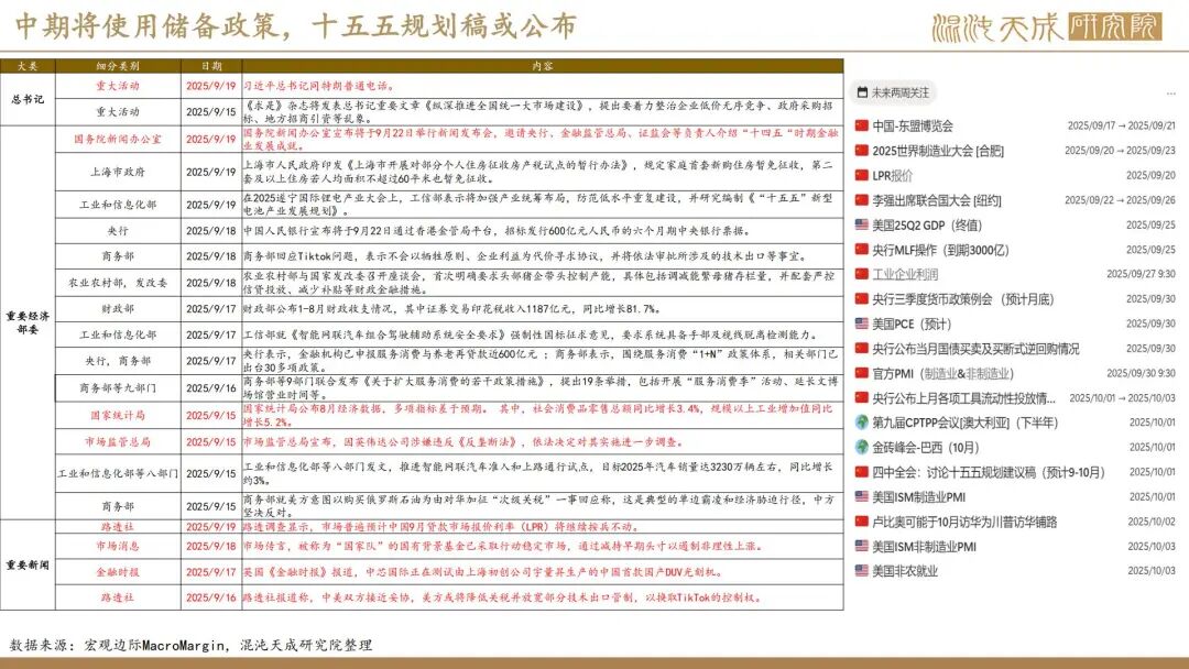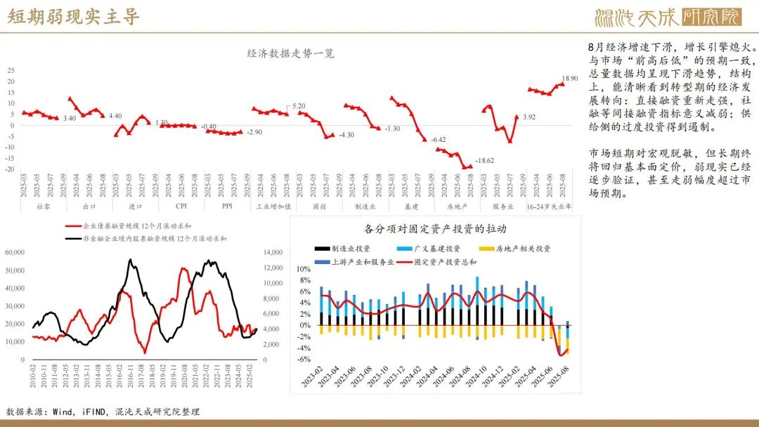短期弱现实主导,中期或将使用储备政策,长期强预期的博弈仍将持续。短期,8月经济数据走弱符合市场预判,但下滑幅度超出市场预期。反内卷龙头多晶硅的行业出清方案仍未落地,碳酸锂停复产传闻反复,生猪行业改革聚焦2026年,当前反内卷“雷声大,雨点小”,第三第四季度经济增长引擎的熄火,暂未看到任何需求侧的应对措施,中期,四季度5000亿已有政策性金融工具叠加其他结构性工具可能投入使用,政府债务置换可能加码,确保GDP目标达成。长期来看,要素市场化改革的试点落地,确立了远期的经济结构化改革方向,或许也表明了向大国大城的转型;十五五对于高水平开放和全国大一统消费市场的建立,或能从根本上带来需求侧的长期改善,走出周期性困境的可能性提高。