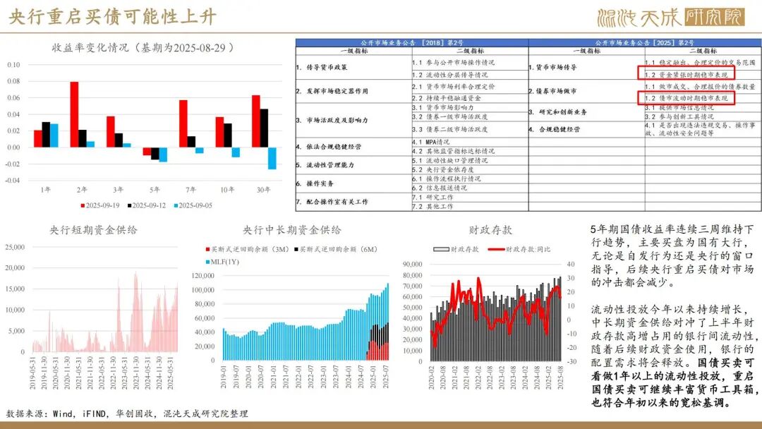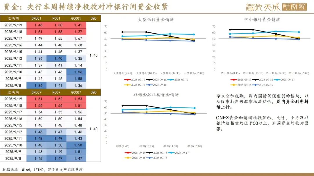 本周复盘:季末叠加税期,周内国债供强虚弱的格局,以及股市打新吸收市场流动性,周内资金利率持续上行;国股行提升净买入规模,以及近期的市场传闻和官媒报道,使得市场对央行重启国债买卖的预期升温;美联储降息未超预期,美元指数走强,市场对货币政策宽松预期减弱;债基新规的修订和中美谈判加剧了市场波动;股债跷跷板影响减弱,但股市慢牛格局仍是压制国债的慢变量。